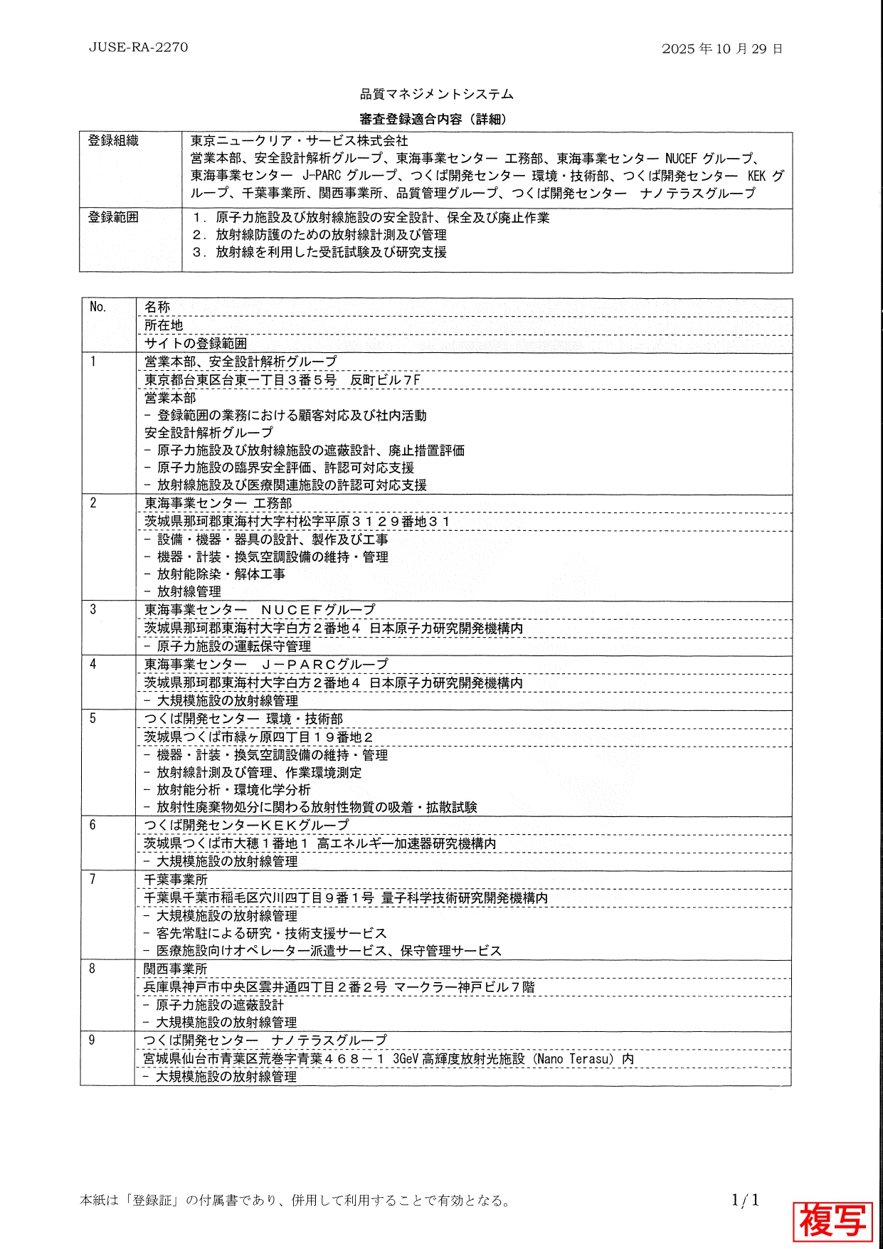 当社は、原子力・放射線の安全活用に関する技術サービスを提供する会社として、法令・規制を遵守し、誠実にかつ確かな技術で社会の要請に応えます。